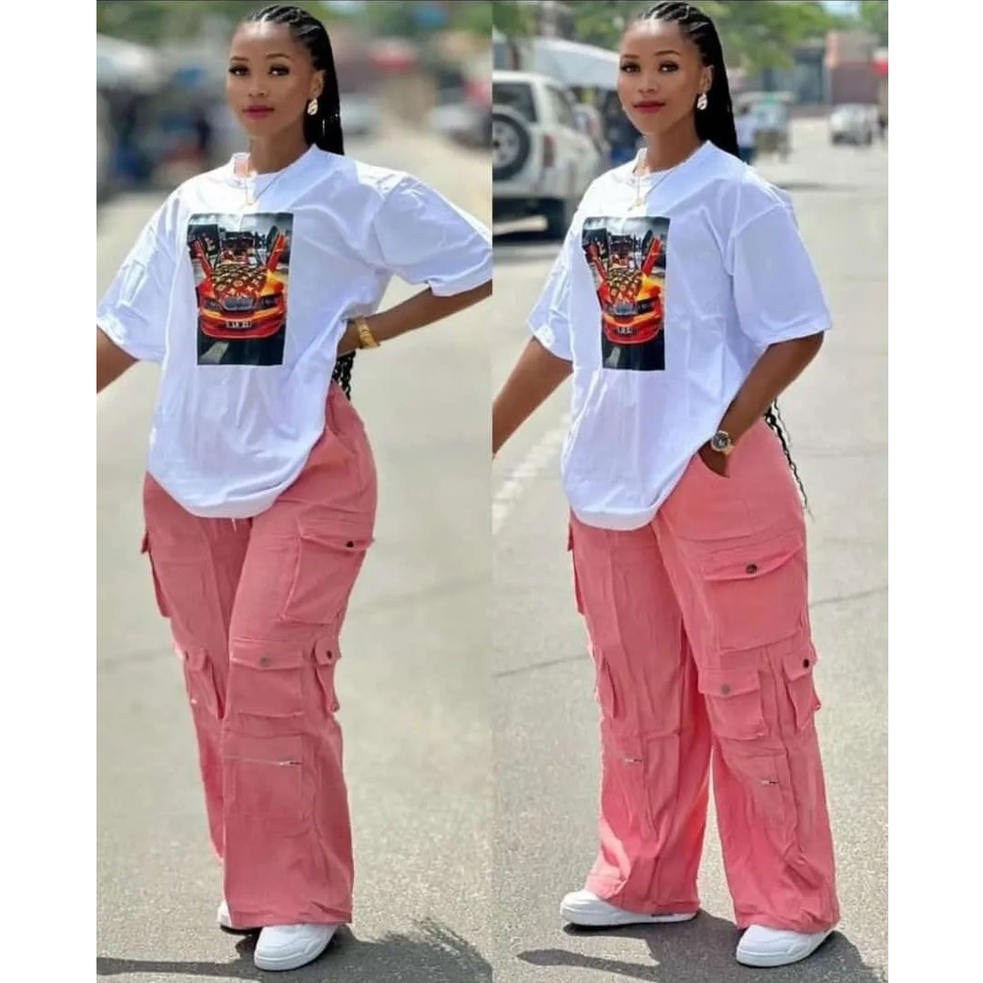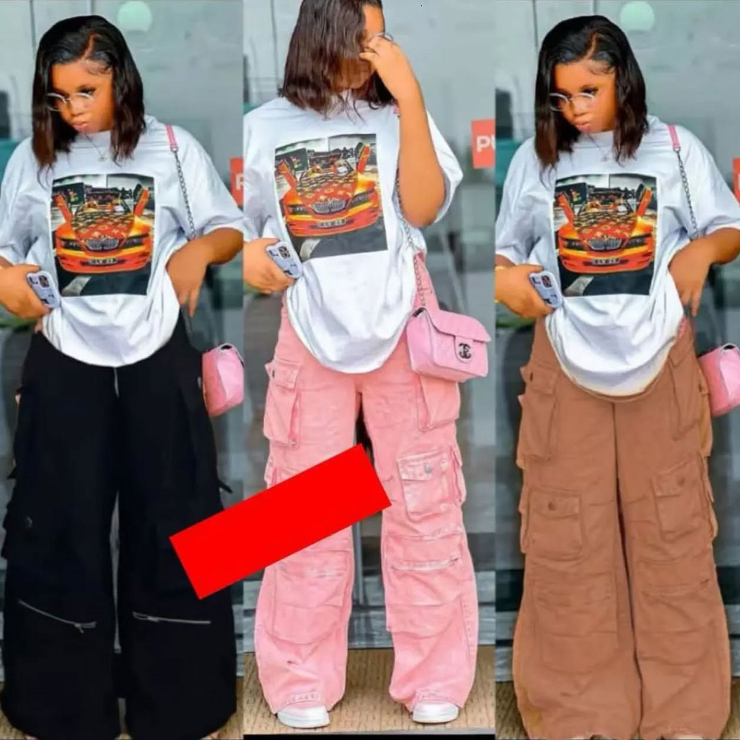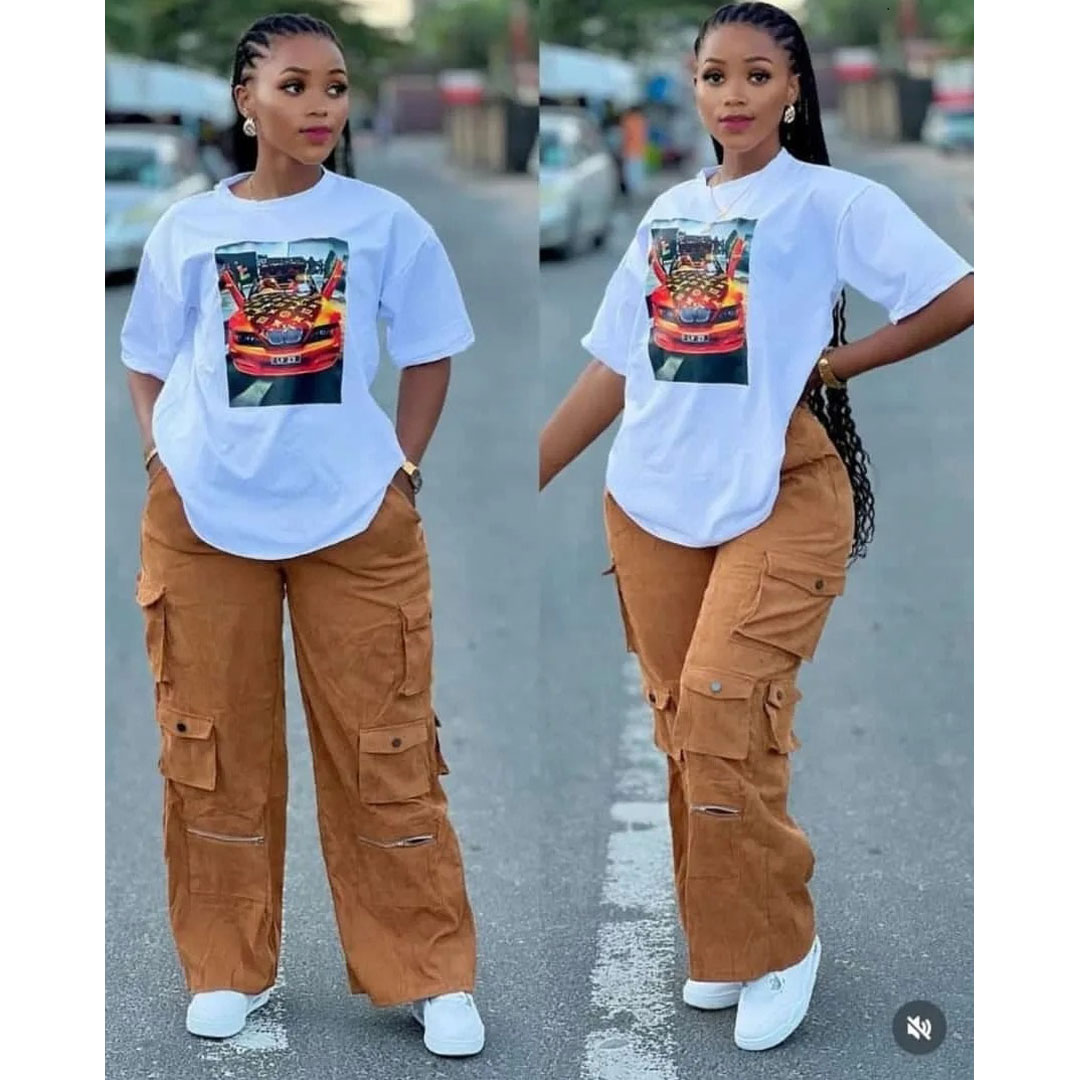 New American retro overalls women’s casual loose corduroy pants two-piece set, set includes: overalls bag pants, T-shirt
