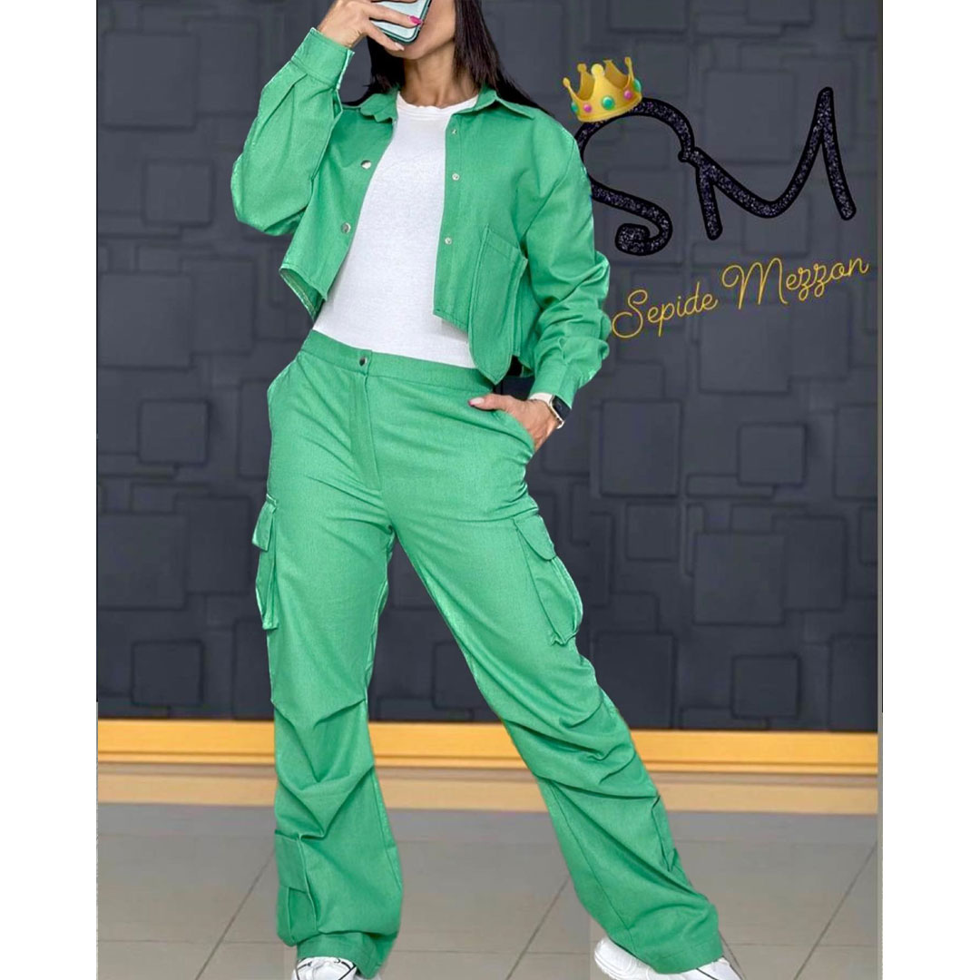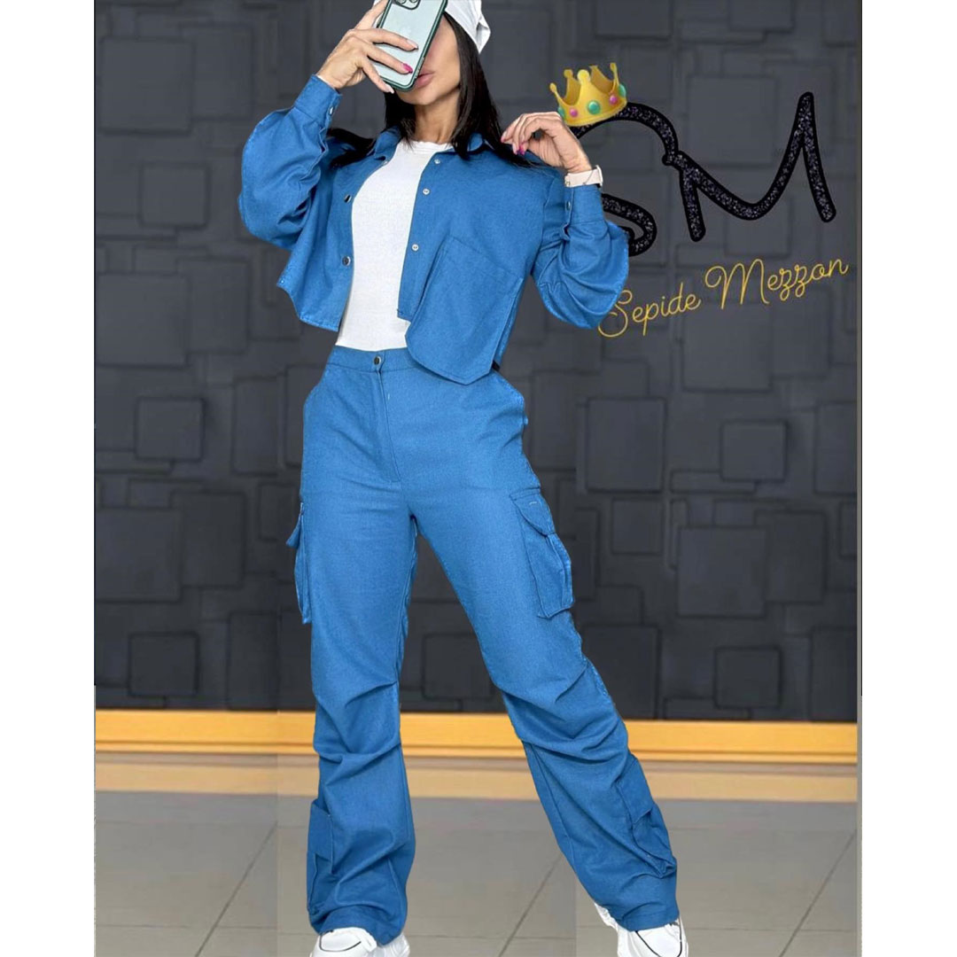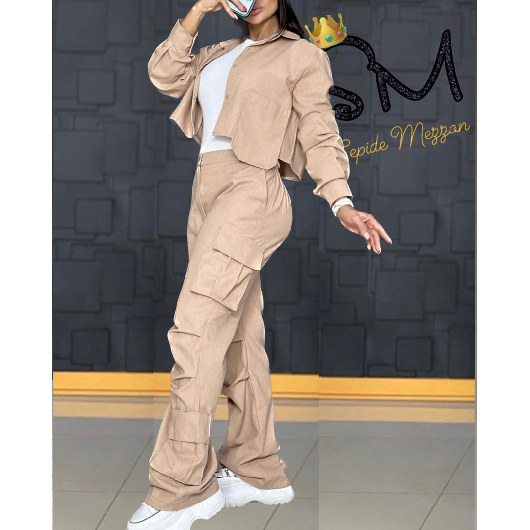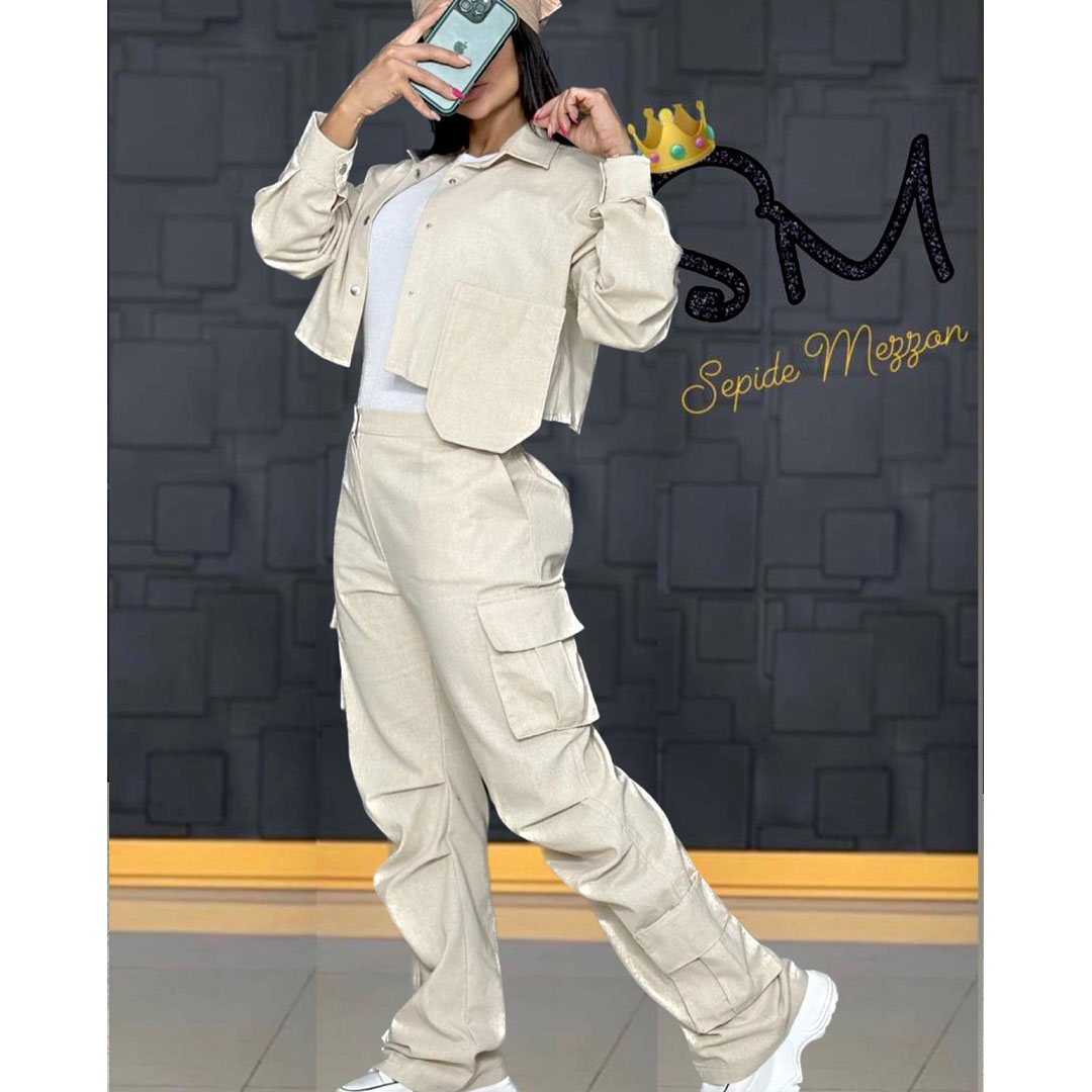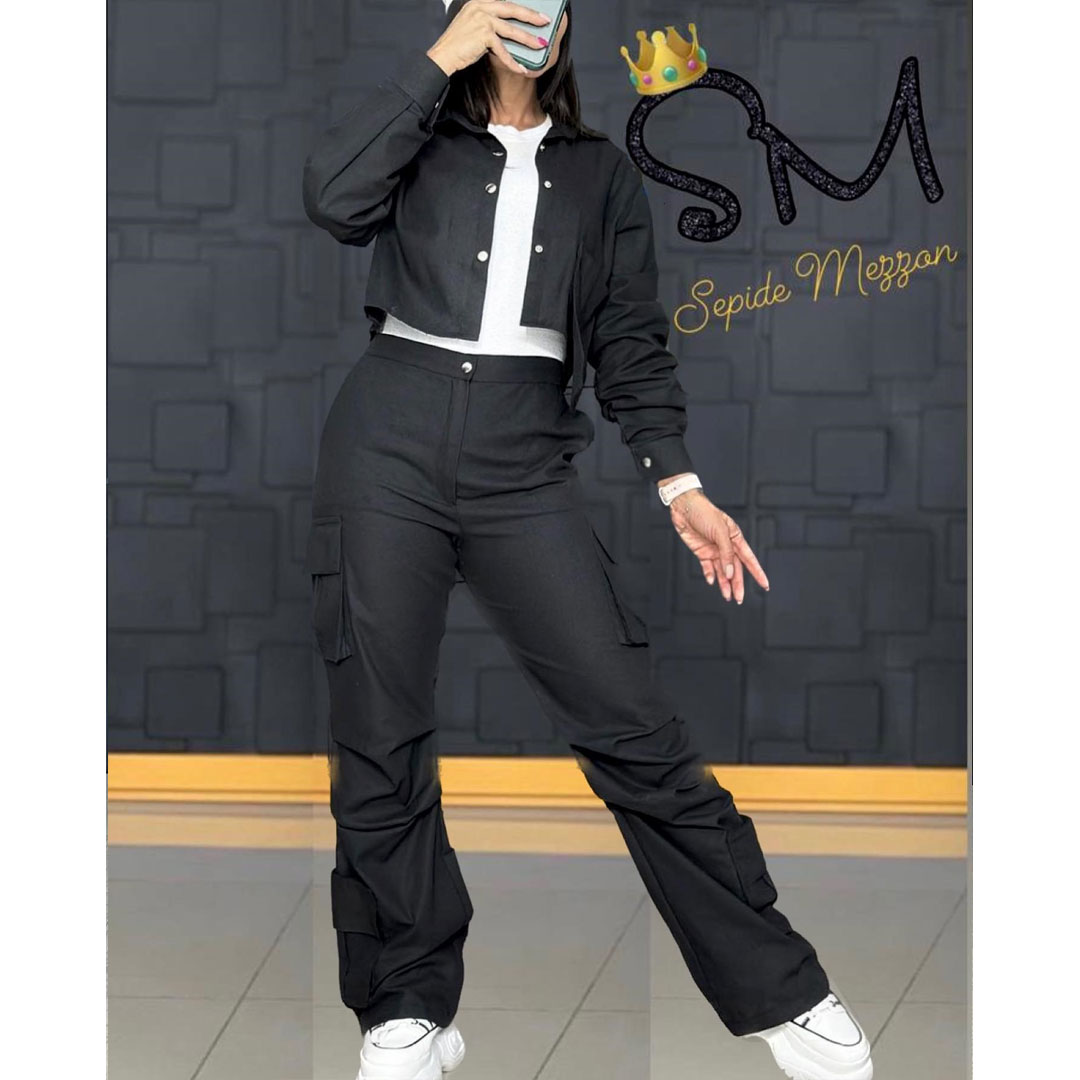 Fashion knitted fabrics with multiple work pockets and casual pants three-piece set, the set includes: work pocket pants, jacket, vest