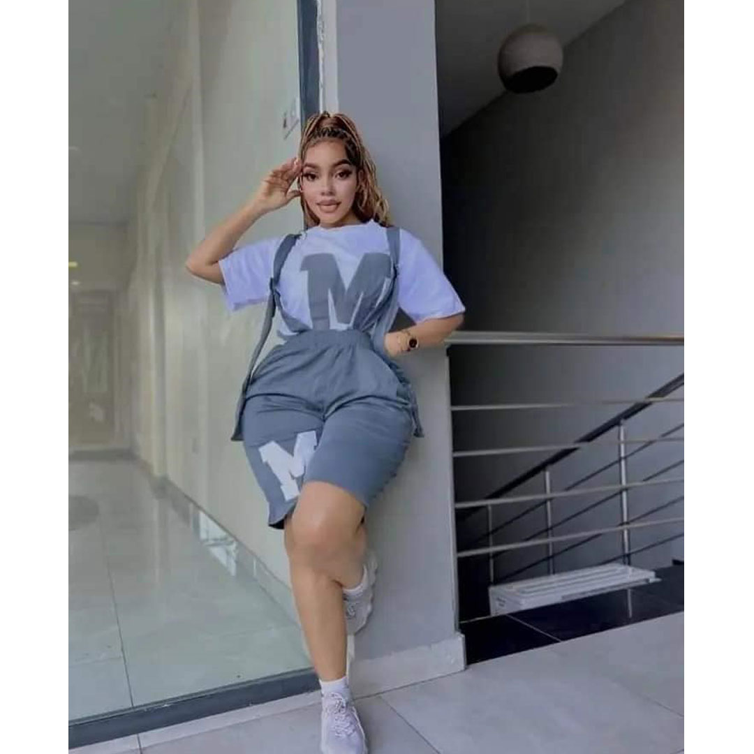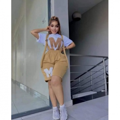 Summer new suit letter print suspenders women’s short-sleeved fashionable two-piece suit, the suit includes: letter print T-shirt, suspenders pants