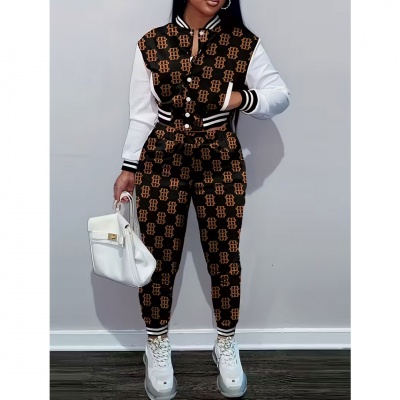 New fashion women’s winter and autumn baseball sportswear printed jacket two-piece set, the set includes: baseball jacket, pants