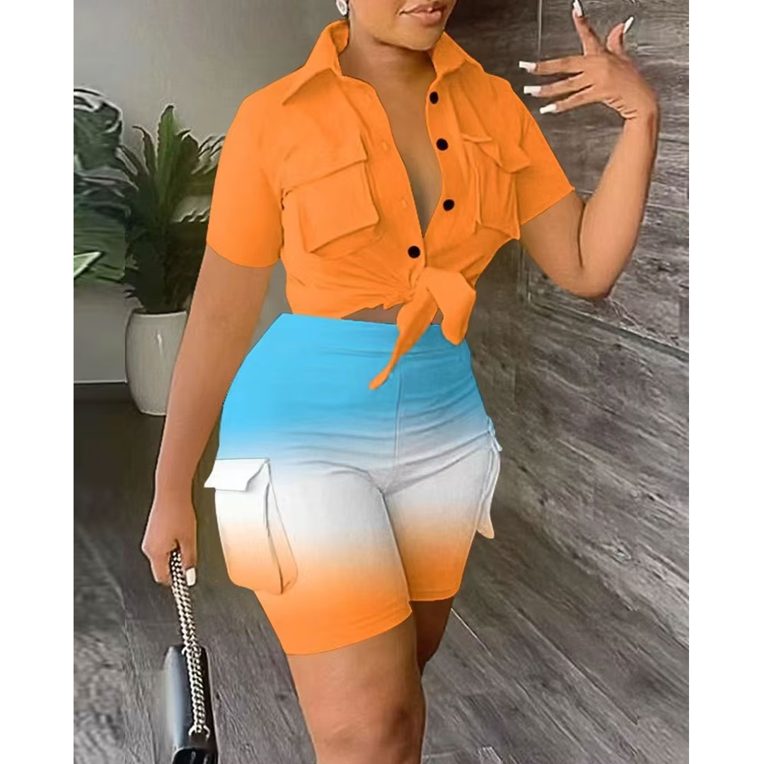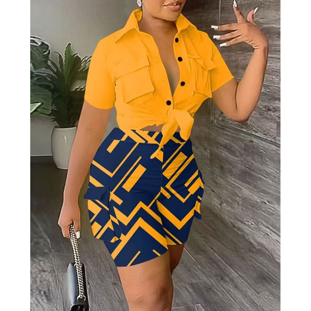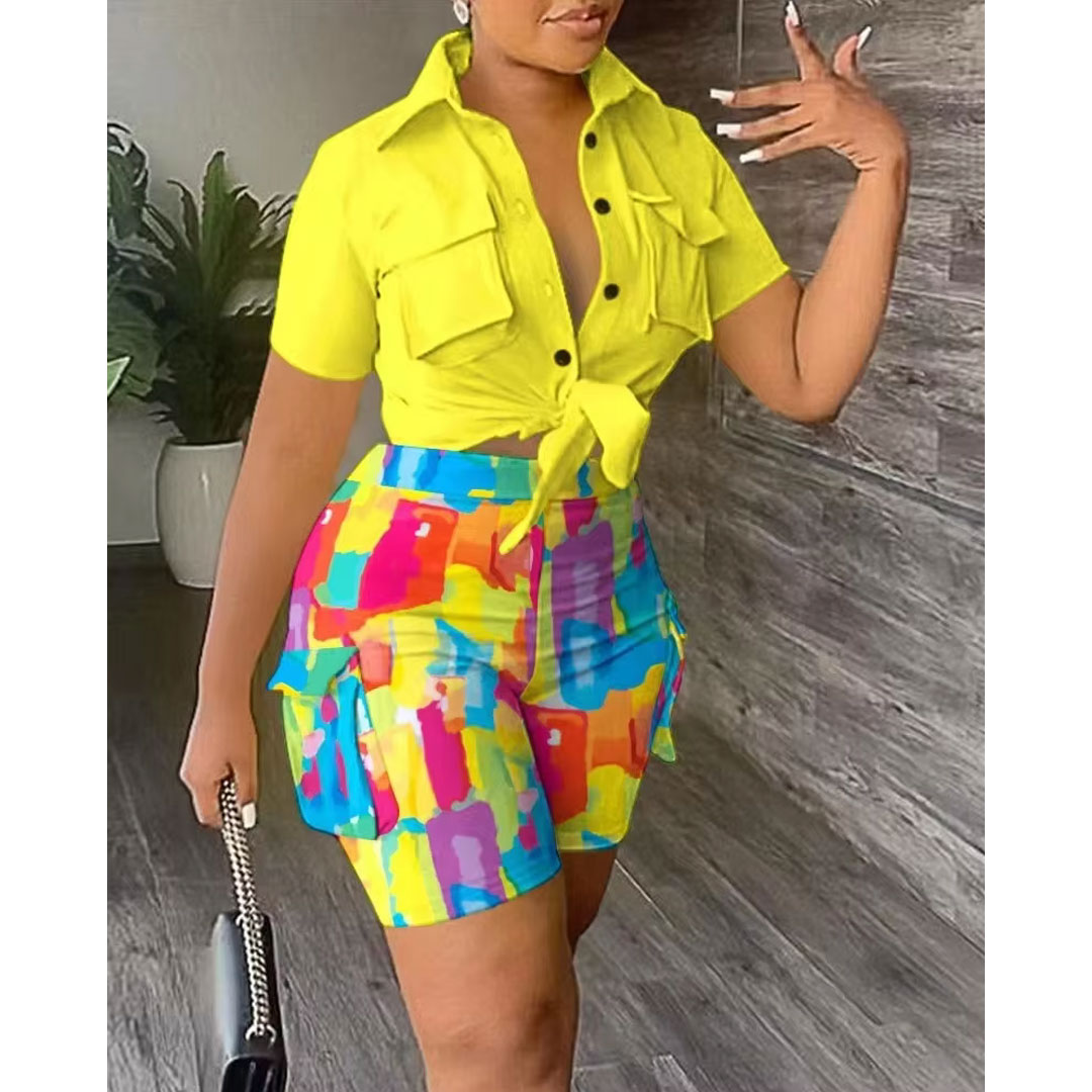 Women’s casual camouflage print sportswear suit summer short-sleeved slim shorts knitted fabric latest design two-piece suit, the suit includes: camouflage shirt, fashionable pants