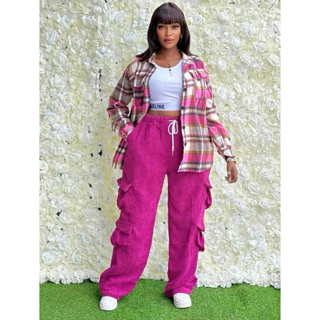 Women’s fashion lapel long-sleeved shirt, casual simple loose multi-pocket pants suit, the suit includes: multi-pocket pants, long-sleeved shirt, vest