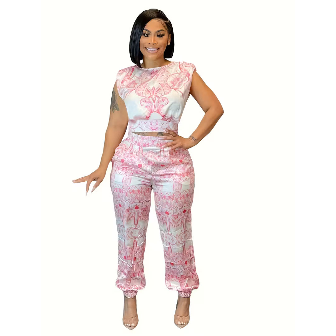Women’s new fashion elegant retro printed high waist top and trousers two-piece set, the set includes: printed top, printed trousers