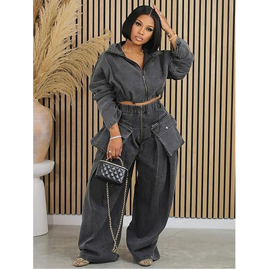 Women’s jacket with multiple pockets, zippered jeans, loose high-waisted jeans. The set includes: zippered jeans, women’s jacket