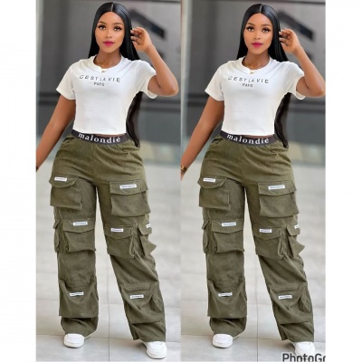 Women’s fashionable corduroy overalls, mid-rise straight-leg style, custom logo, casual summer multi-pocket pants wholesale, set includes: multi-pocket overalls, fashionable vest